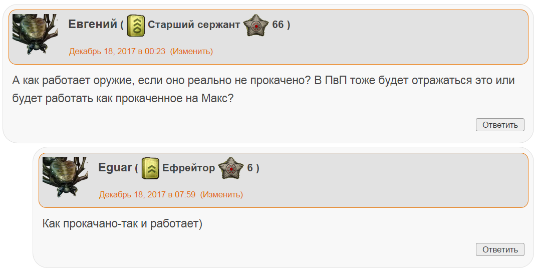 Plumbum, много раз уже обсуждалось, читайте форум в теме ПВП. Единого мнения нет, но многие, в т.ч. и я, склонны считать, что как прокачено, так и стреляет ЧИТАЕМ ТУТ